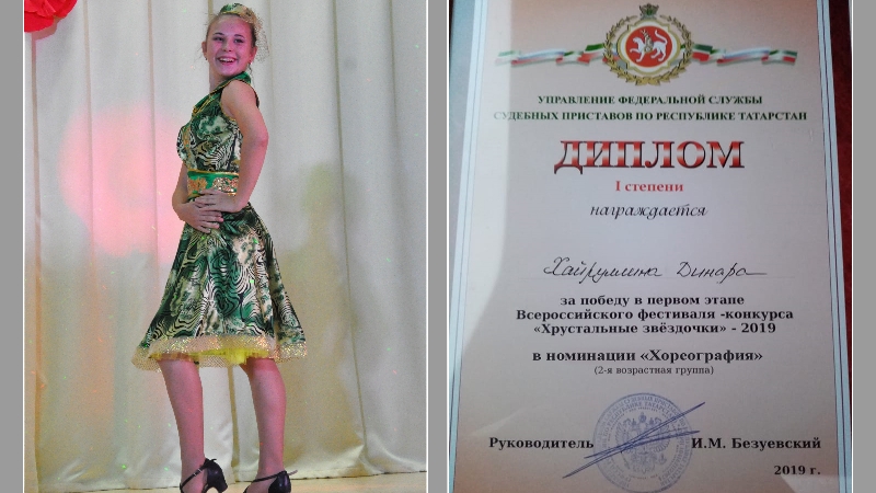 В этом году диплом I степени получила Хайрулина Динара за победу в первом этапе Всероссийского фестиваля - конкурса "Хрустальные звездочки" - 2019 в номинации "Хореография" (2-я возрастная группа).