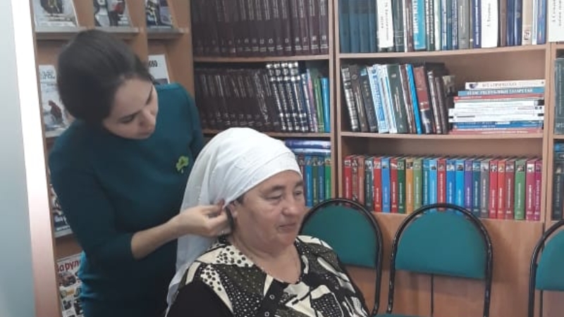 поделились мастерством по завязованию мусульманского платка .