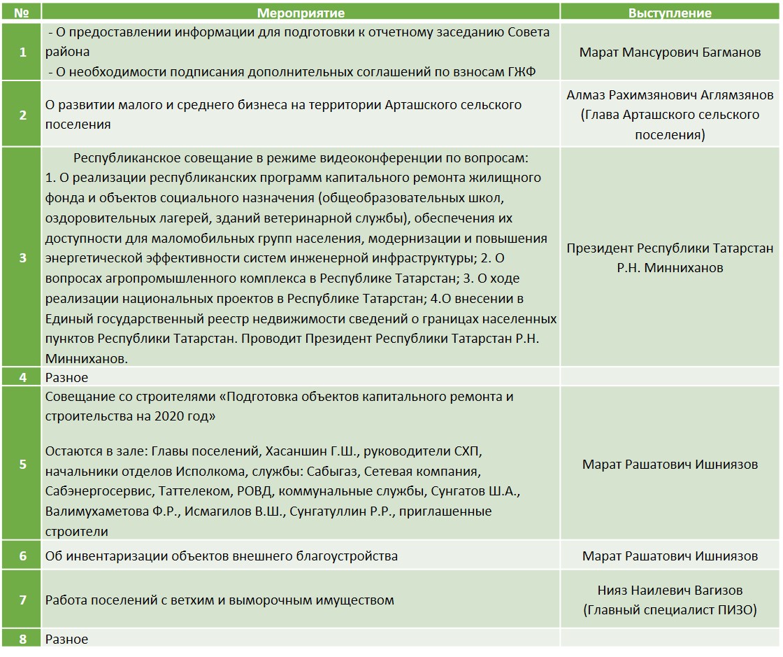 11 января 2020 года в 8:00 часов Глава Сабинского муниципального района Раис Минниханов проводит совещание с активом района. Список приглашенных и повестка ниже.