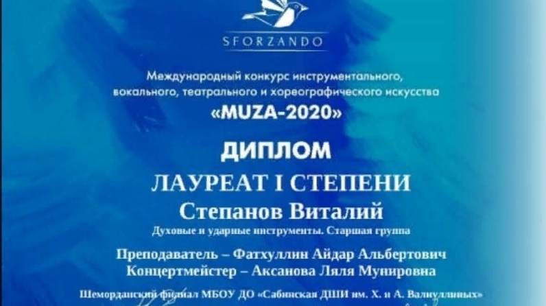 12 апреля в г. Казани проводился в заочной форме Международный интернет-конкурс инструментального, вокального, театрального и хореографического искусства "MUZA-2020". На конкурсе была представлена видеозапись в исполнении Степанова Виталия - ученика 4 класса духовых инструментов (рук. Фатхуллин А. А.) Шеморданского филиала Сабинской ДШИ с произведением К. Сенс-Санса "Слон". Конкурсант был отмечен дипломом Лауреата 1 степени. Поздравляем призера конкурса и его преподавателя с победой!