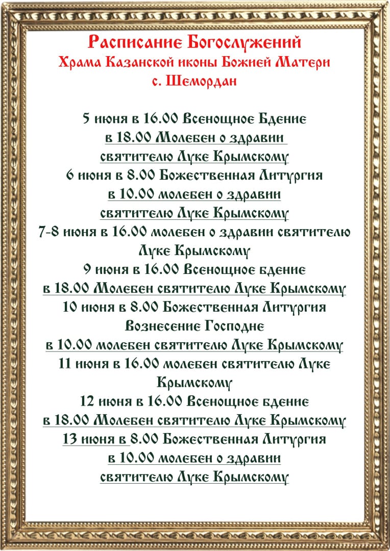 Братия и сестры! В Храме Казанской иконы Божией Матери с.Шемордан с 5 по 13 июня будет пребывать чудотворная икона с частицей мощей святаго святителя Луки Крымского, перед которой будут служиться молебны о здравии, строго по расписанию богослужений, в это время вы сможете поклониться святыни Святому Луке обращаются люди, страдающие разными заболеваниями, потерявшие надежду на излечение, перед сложными операциями, в поисках нужного врача или лекарства от недуга, а также доктора и, конечно, хирурги, Покровителем которых является Святитель. К Луке Крымскому обращаются за помощью в следующих случаях: молятся об исцелении от болезней: ушных и глазных болезней, опухолей, мигреней; женщины обращаются с просьбой о благоприятном течении беременности и лёгких родах; бесплодные молятся о даровании детей; больные просят о благополучном проведении операций при необходимости хирургического вмешательства; помогает святой Лука и в установлении точного диагноза и назначении нужного правильного лечения.