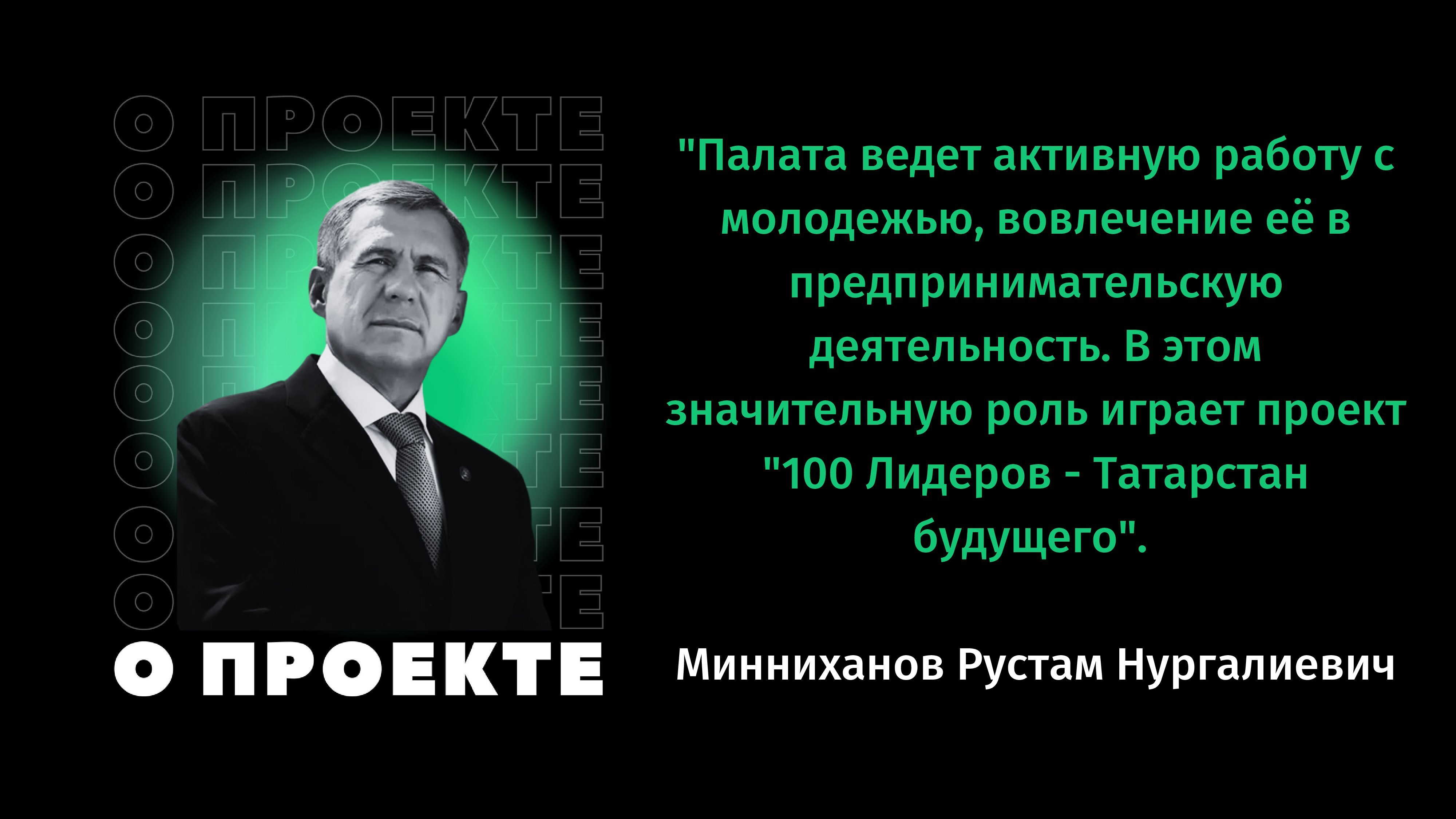 "100 лидеров - Татарстан будущего" - это республиканский молодѐжный проект для поиска, отбора, поддержки и сопровождения идей и проектов, вовлечения в предпринимательскую деятельность талантливой молодежи Республики Татарстан.