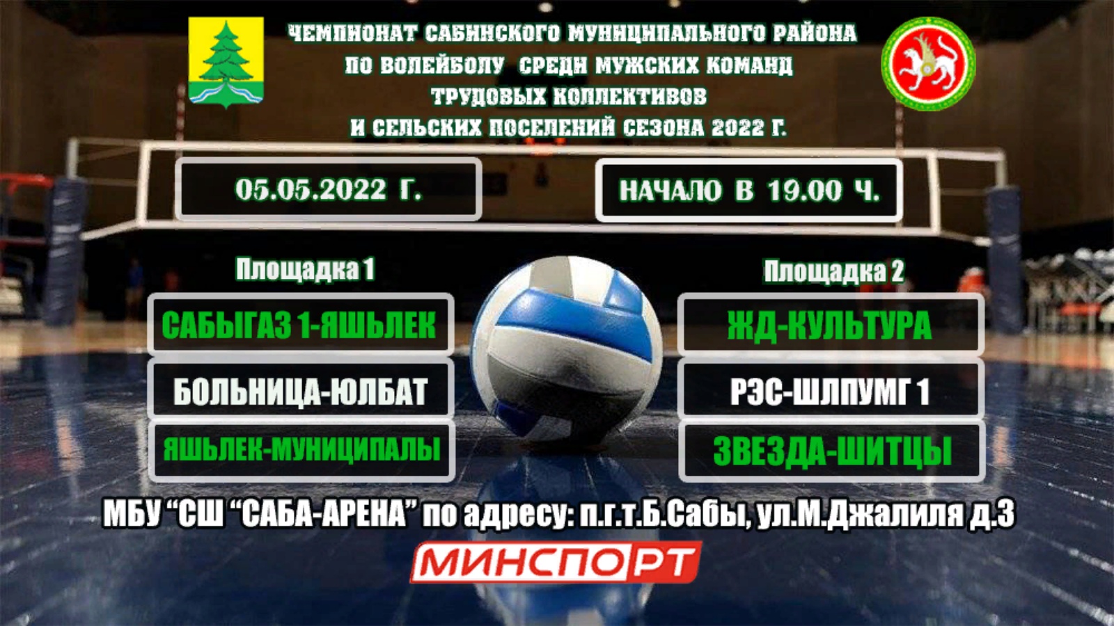 5 мая 2022 года в МБУ "СШ "САБА-АРЕНА" (п.г.т.Б.Сабы, ул.М.Джалиял,д.3) пройдут очередные игры Чемпионата Сабинского муниципального района по волейболу среди мужских команд трудовых коллективов и сельских поселений сезона 2022г. Приглашаем всех желающих поболеть за любимые команды. Начало игр в 19:00.