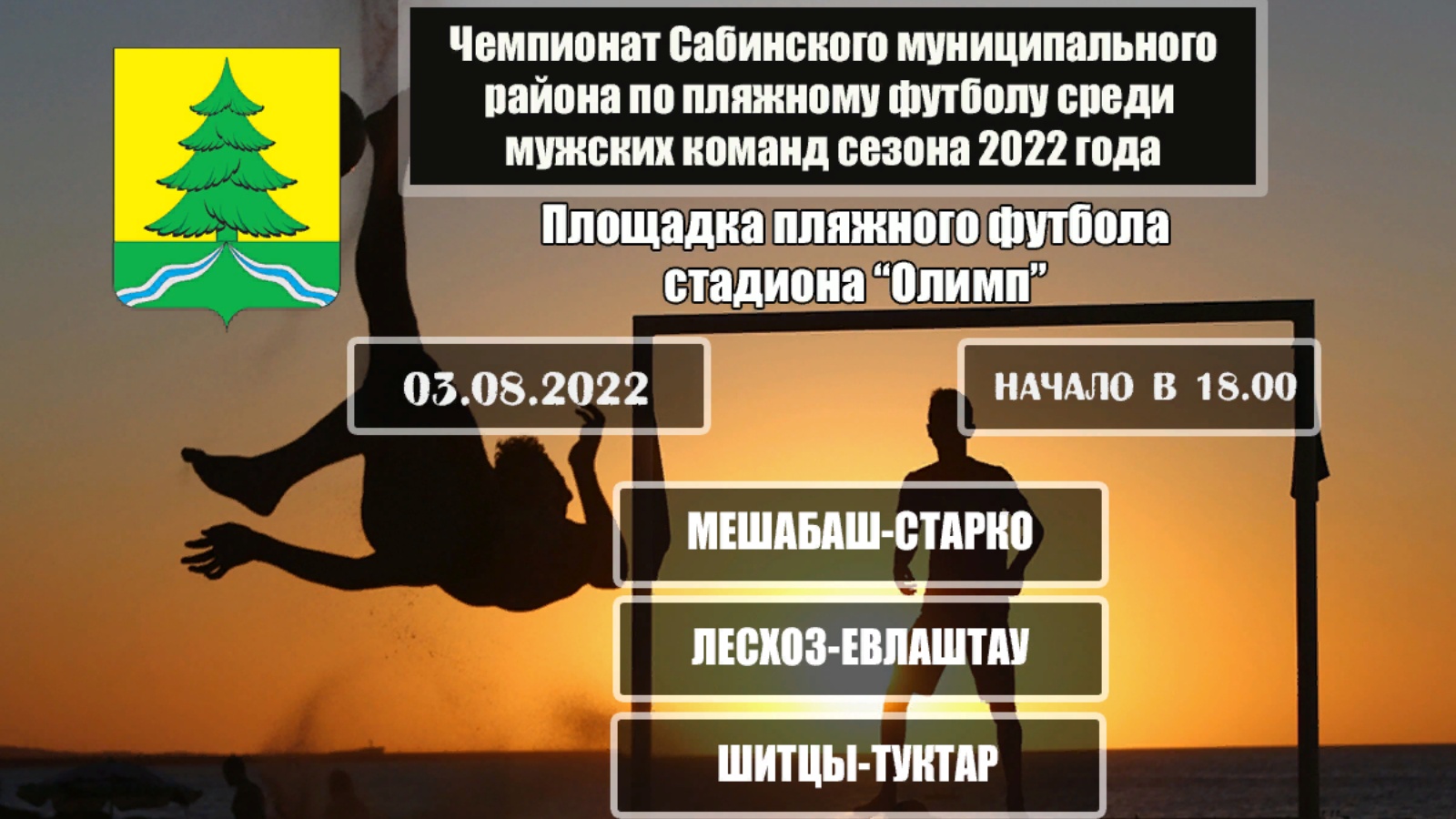 Сегодня 3 августа 2022 года состоятся очередные игры Чемпионата Сабинского муниципального района по пляжному футболу среди мужских команд сезона 2022 года.