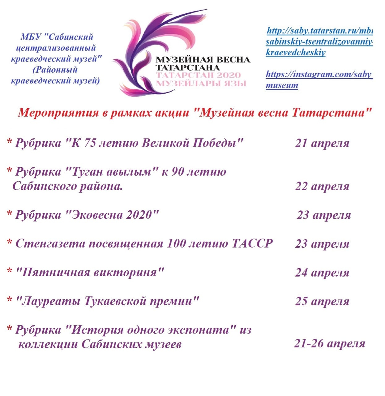 21 апрельдән 26 апрельгә кадәр "Татарстанның музей язы – 2020 " проекты беренче тапкыр онлайн-форматта узачак. Пандемия зәхмәтендә дә музейлар, тарихи-мәдәни мирасны саклап калып, яңа дәрәҗәдә, тарих сөючеләр белән һәрвакыт элемтәдә эшләвен дәвам итә. Шул рәвешле, тәрбия һәм сәнгать зәвыгын үстерә.