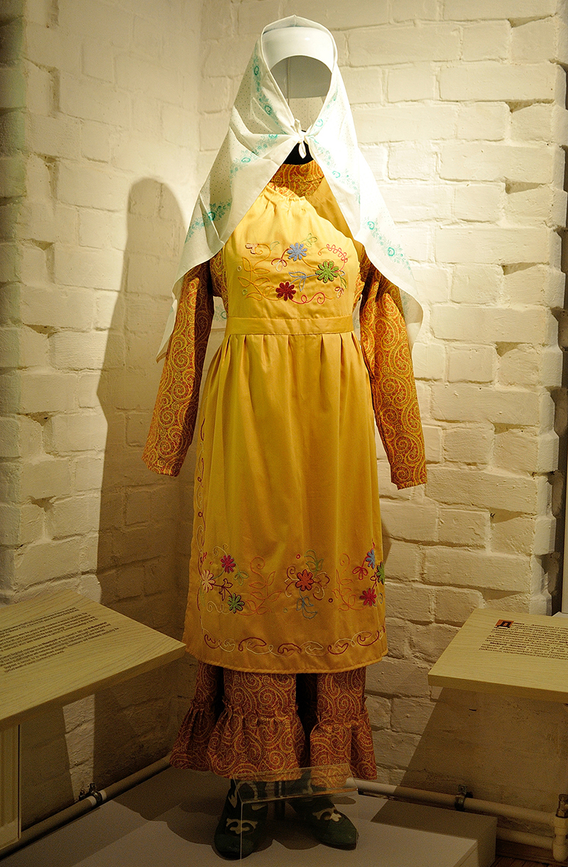 Шулай ук Сатыш авылы мәдрәсәсе музее экспонаты - ХIХ гасыр ахыры — XX гасыр башы татар авылларында традицион хатын-кызлар костюмы: кулмәк, алъяпкыч, яулык, читекләр.