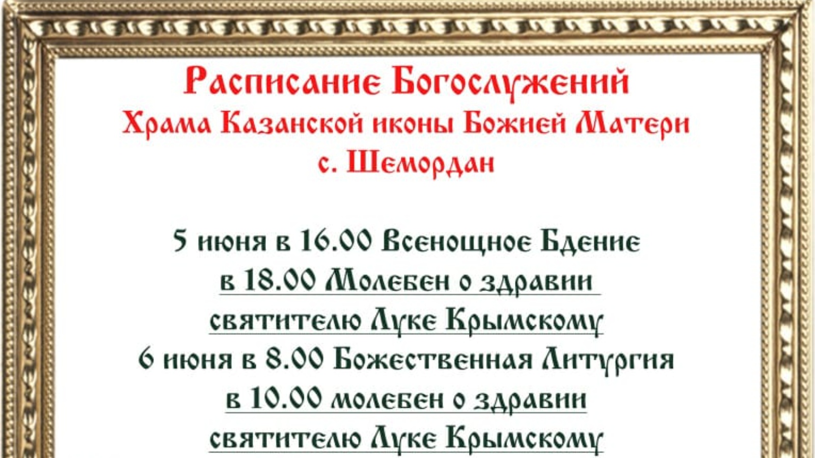 Авылдашлар,райондашлар! 5 июньнән 13 июньгә кадәр Шәмәрдән авылының Казан Мәрьям Ана иконасы храмында изге Лука Крымскийның бер өлеше булган могҗиза тудыручы икона булачак.Изге Лука Крымскийга төрле авырулардан җәфа чигүче, дәвалануга өметен югалткан кешеләр, авыр операцияләр алдыннан, кирәкле табиб яки авырудан дарулар эзләүчеләр, шулай ук табиблар һәм, әлбәттә, хирурглар мөрәҗәгать итә.