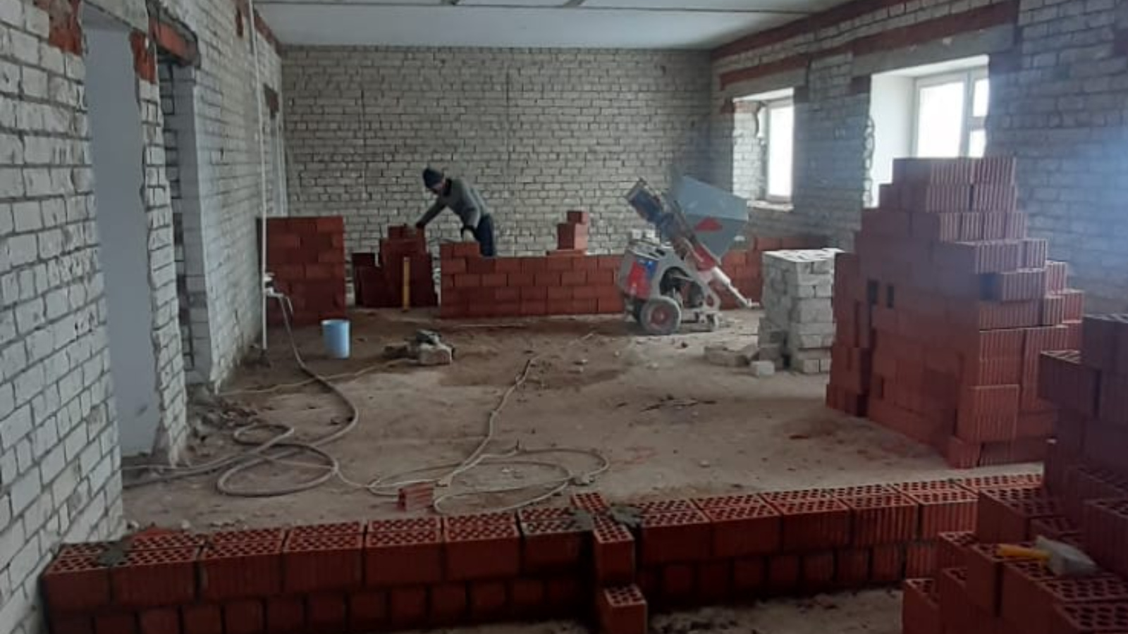 Объектта демонтаж, электромонтаж эшләре алып барыла. Бүлемне кору эшләре башкарыла. "РемонтСтройСервис"ҖЧҖ подряд оешмасы