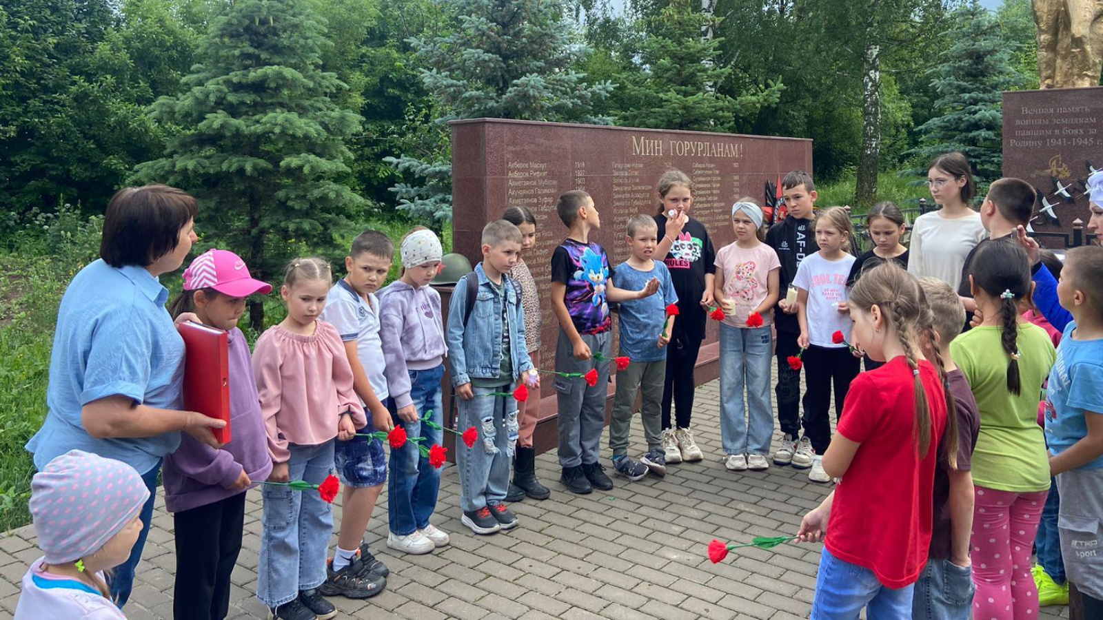 Катнашучылар сугыштан кайтмаганнарны искә алу өчен обелиск янына җыелдылар. Алар Бөек Ватан сугышында һәлак булган ватандашларыбыз истәлегенә чәчәкләр салдылар. Аларны 1 минут тынлык белән искә алдылар.