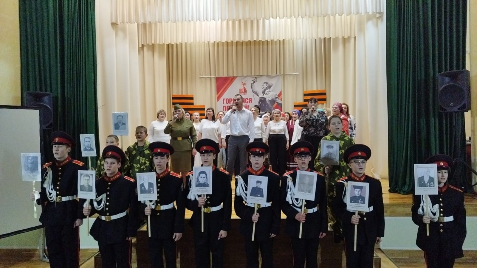 Концерт документаль фото һәм видеоматериаллар күрсәтү белән үрелеп барды. Программаның финалында җиңү көне җыры яңгырады. Зал басып, көчле алкышлар белән Җиңү гимнын җырладылар.